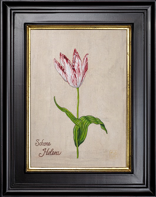 The “Schone Helena” tulip, a majestic tulip with red stripes and pointed leaves, is considered a true goddess among tulips.