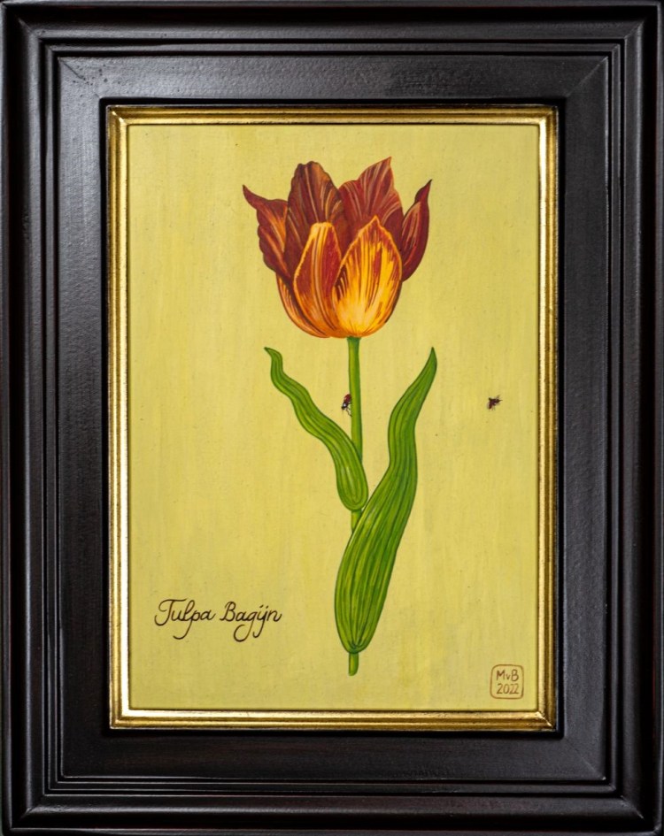 The “Bagijn” is a tulip that stands out both for its color and its name. Its petals are vivid yellow with many red accents adorning them, like flames dancing against a red sky. Two ladybugs are seeking shelter by the tulip.