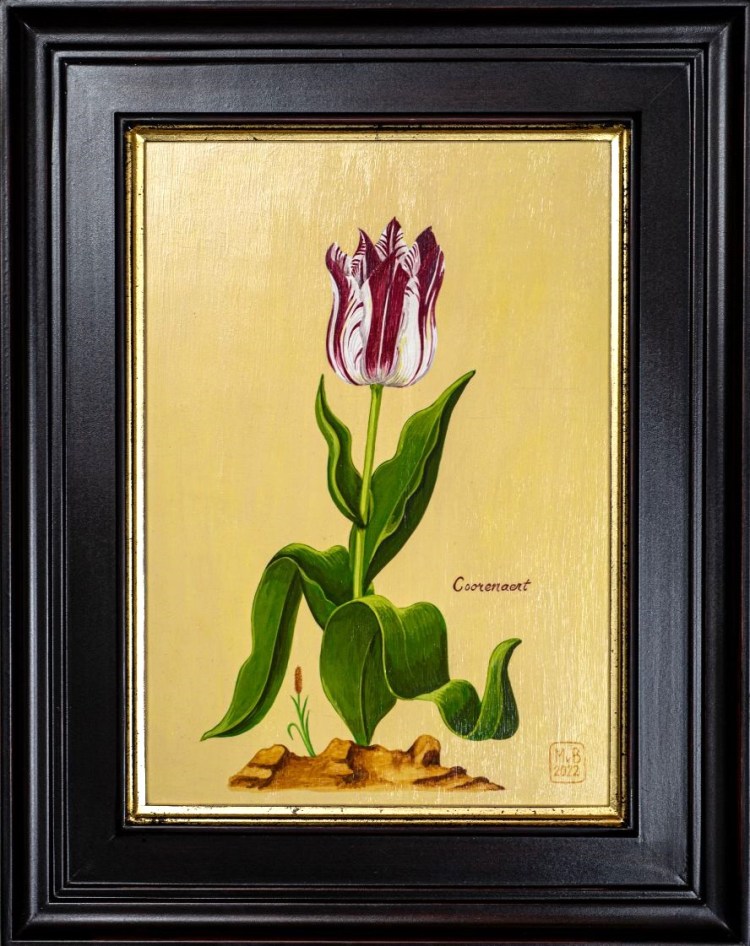 Some of these tulips are not explicitly named but are symbolically depicted in the image based on the meaning of the name. ‘Coorenaert’, a term from Old Dutch, refers to a ‘spike’, the upper part of a grain stalk where the grains are located. Although the precise origin of the name remains unclear, it may be a reference to Demeter, the Greek goddess of the harvest, who is often depicted with a spike.