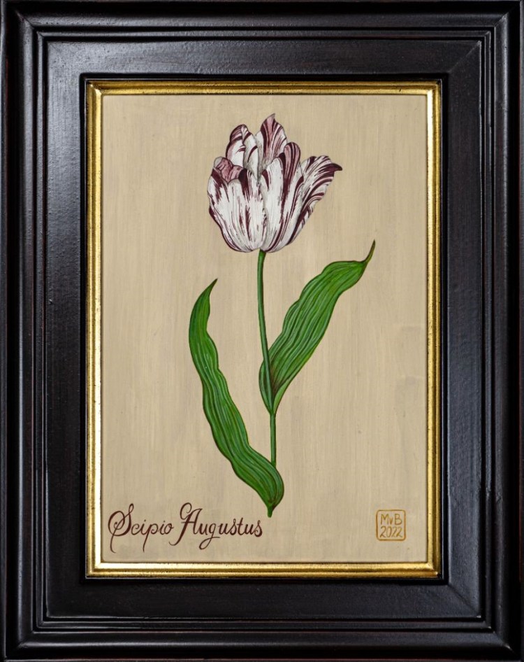 The “Scipio Augustus”, a stately tulip with purple-red stripes, enjoyed great popularity during the Tulipmania.