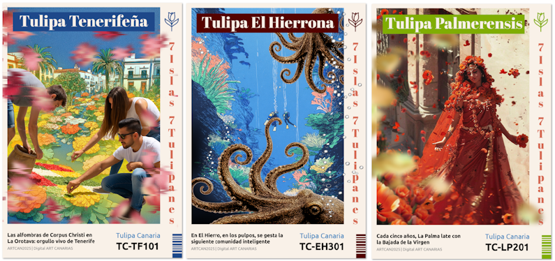 This art project celebrates the cultural and biological richness of the Canary Islands through seven unique tulip paintings.